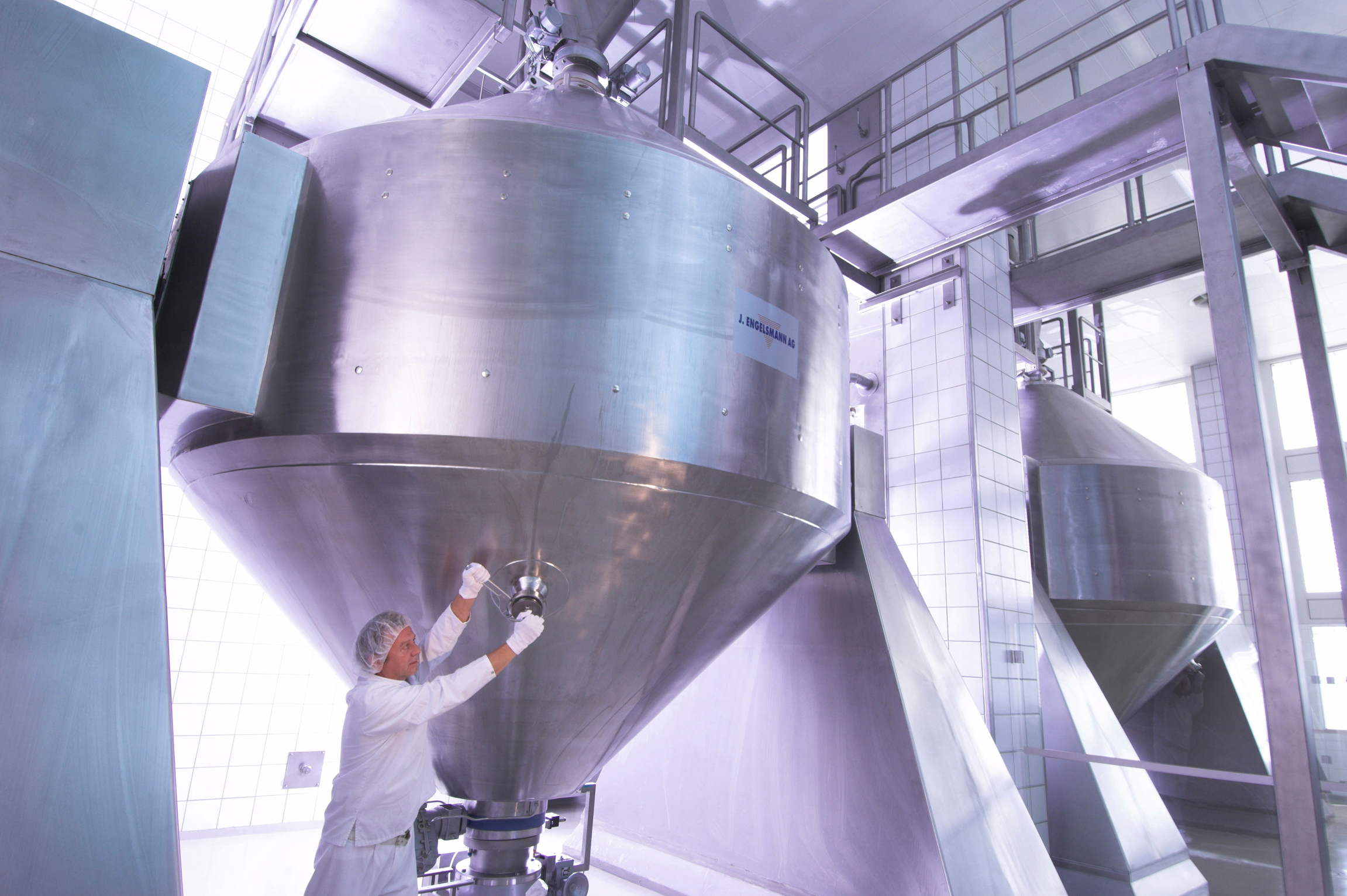 Zwei der weltgrößten Doppelkegelmischer mit einem Fassungsvermögen von jeweils 21 Kubikmetern stellen die Mischungen her, die zum Pressen von Aspirin™ Tabletten verwendet werden.