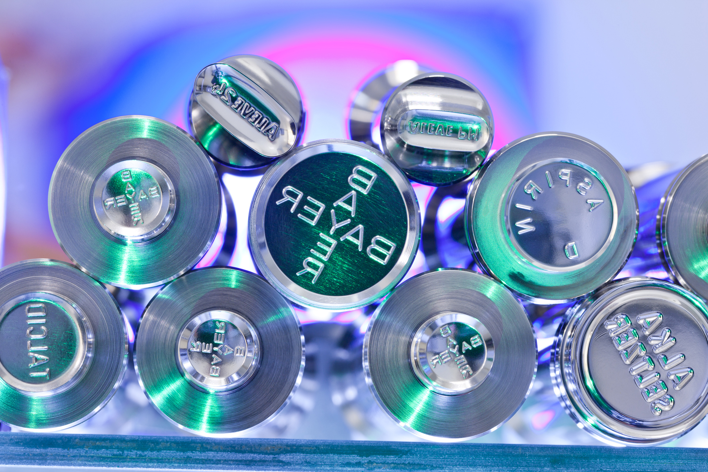Ein Stempel, um die Aspirin™ Tabletten zu formen und mit ihrem Branding zu versehen. Aspirin™ ist eine globale Kultmarke von Bayer mit einer langen Tradition in der Verbesserung der Gesundheit von Menschen. Es lindert leichte Schmerzen, senkt Fieber und ist ein entzündungshemmendes Medikament. Aspirin™ kann auch Leben retten, da es zur Vorbeugung von kardiovaskulären Ereignissen eingesetzt wird. Die Nutzungsrichtlinien für Aspirin™ variieren je nach Land.