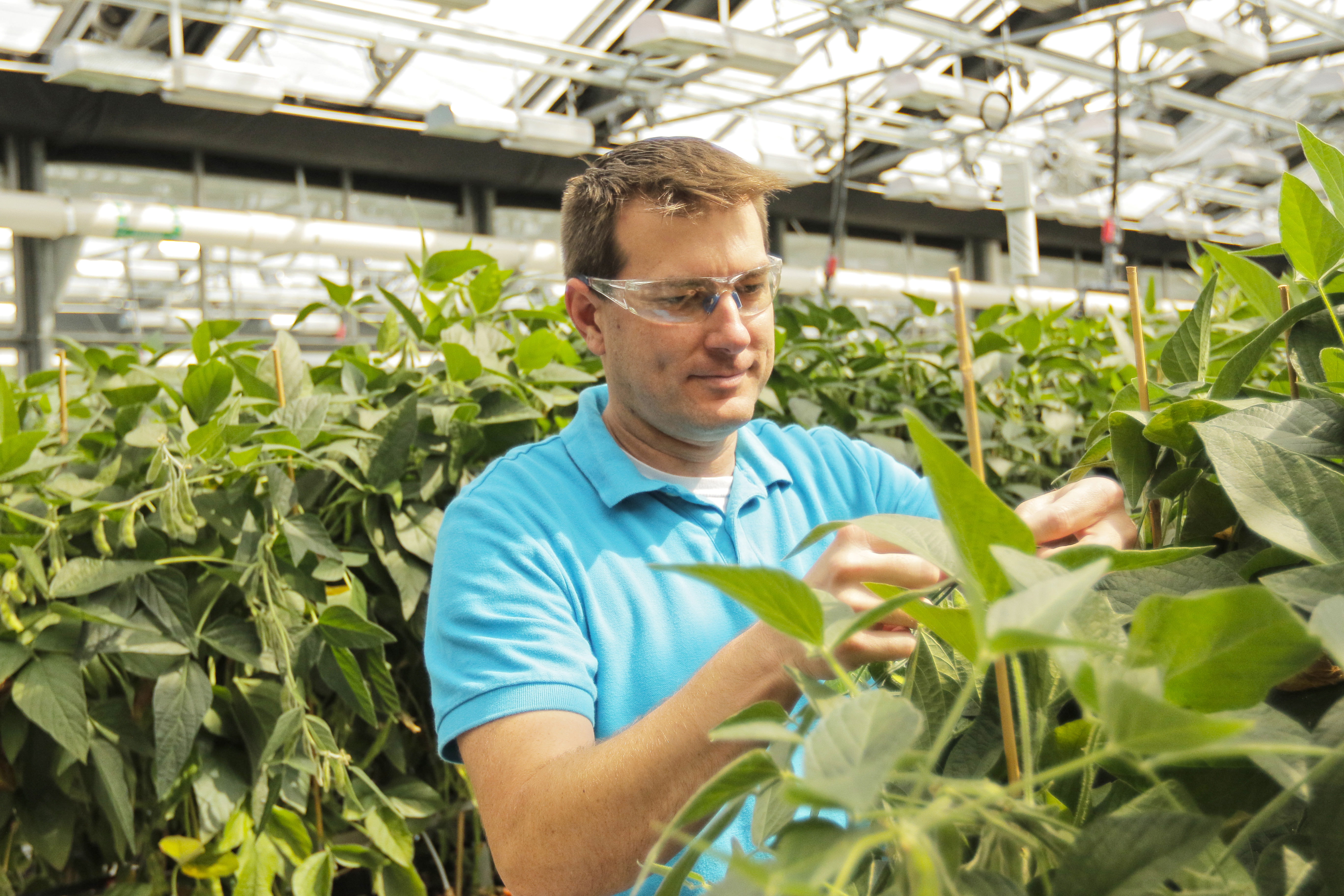Researcher inspecting soybeans