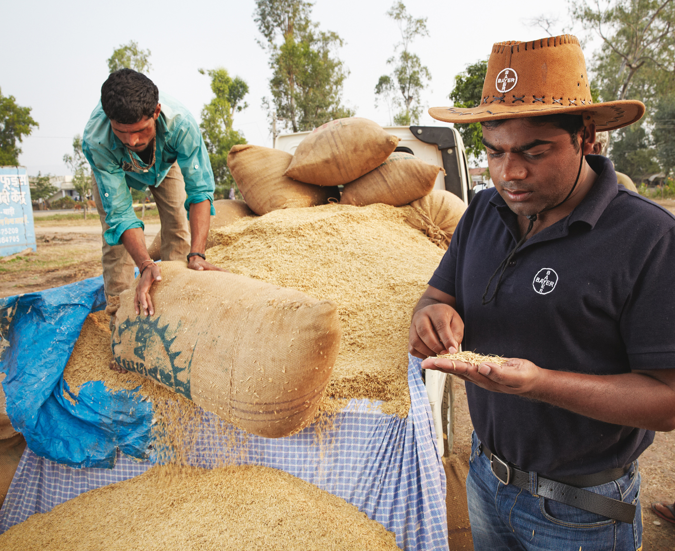 Bayer‘s international ‘Food Chain Partnership’ projects support producers, exporters, traders and processors worldwide in their efforts to supply the consumer a wide range of high-quality harvests like e.g. rice.’ The photo shows a Bayer manager in Bhopal, India checking freshly harvested rice.