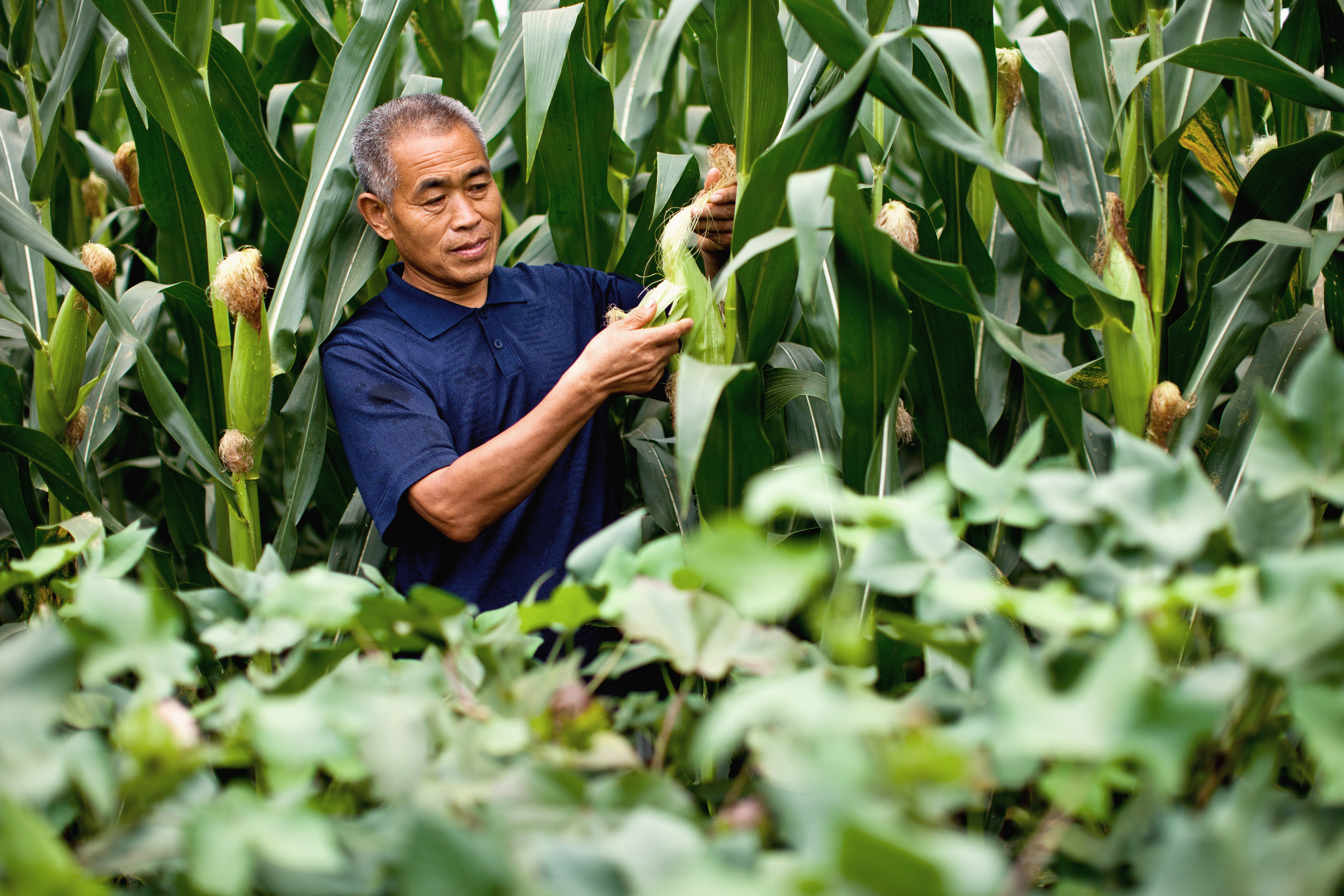 Farmer inspecting the health condition of a corn plant.