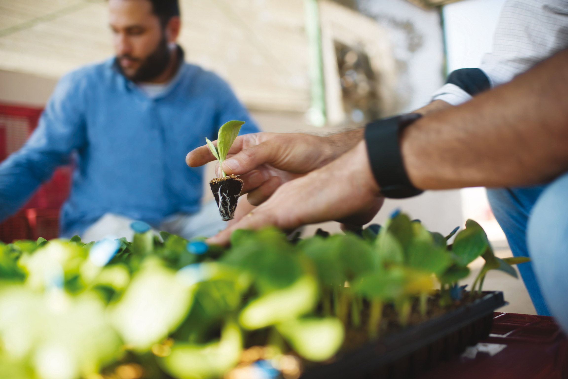 Brazilian farmers examining zucchini seedlings before planting.